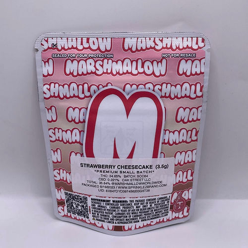 Strawberry Cheesecake Marshmallow is a balanced hybrid (approx. 55% indica, 45% sativa) with a THC content of 33.48% and CBD of 0.445%.